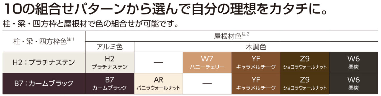 | 屋根材カラーの種類 | アルミ色:プラチナステン・カームブラック 木調色:ハニーチェリー・カラメルチーク・ショコラウォールナット・桑炭・バニラウォールナット |