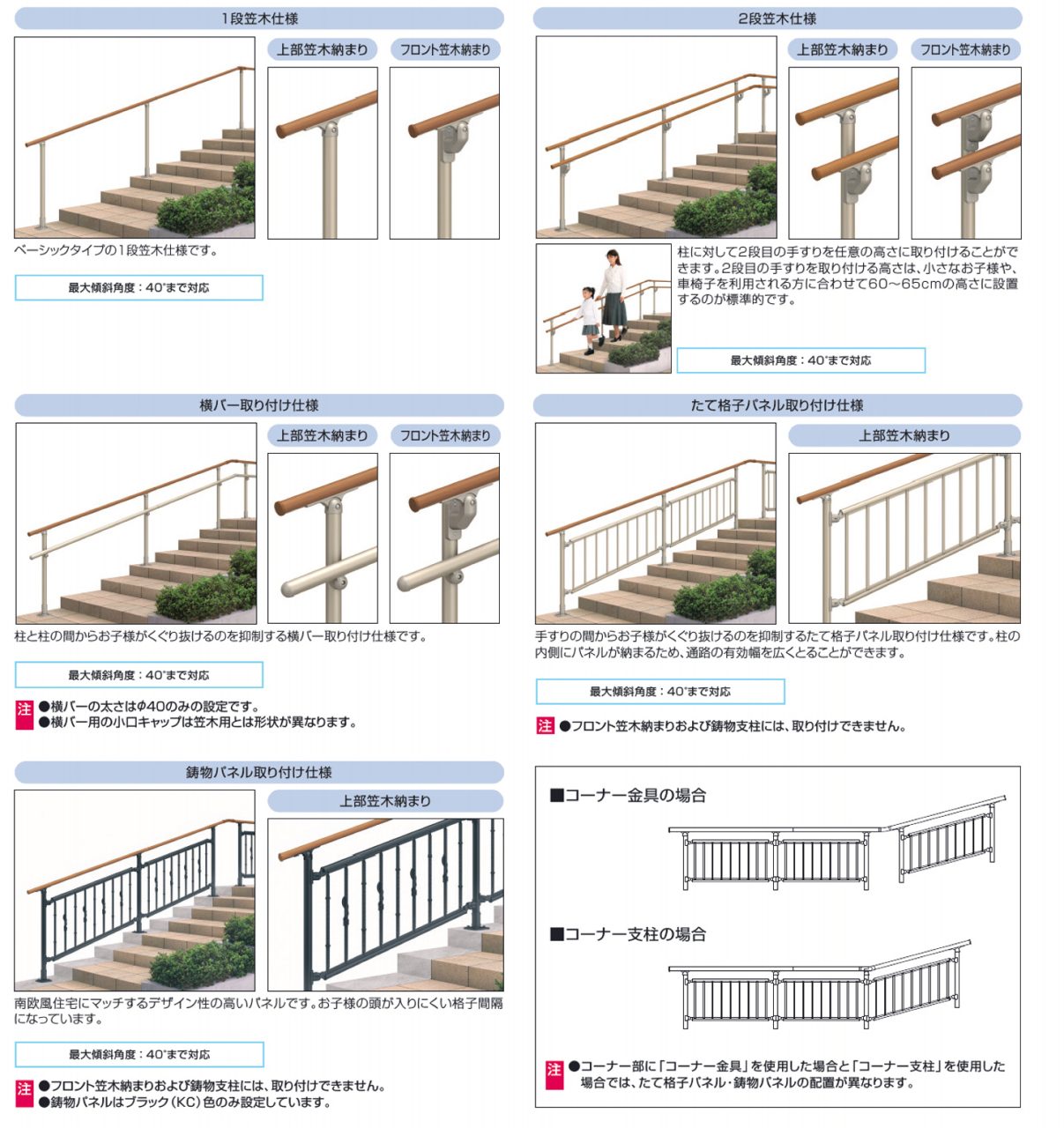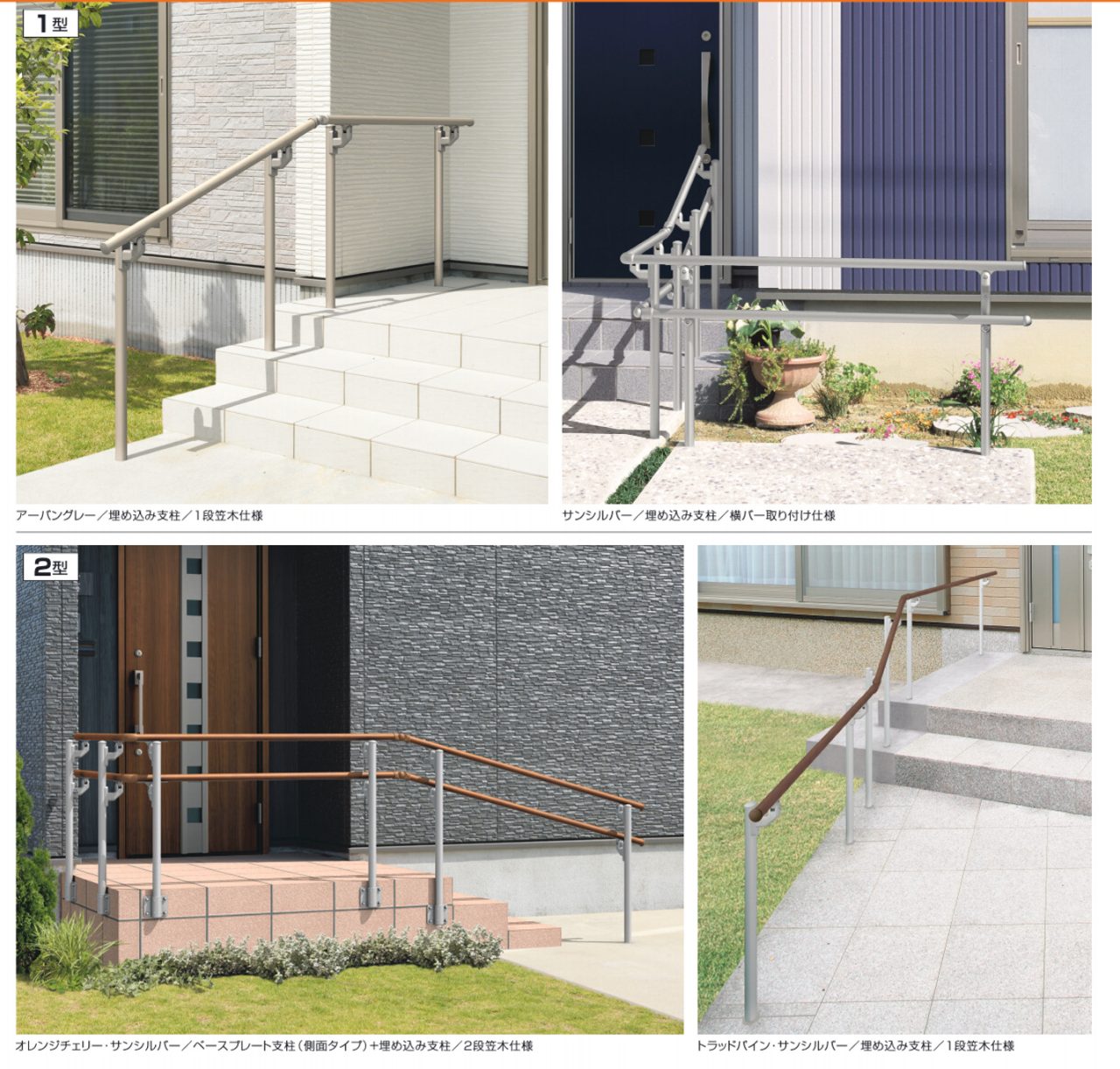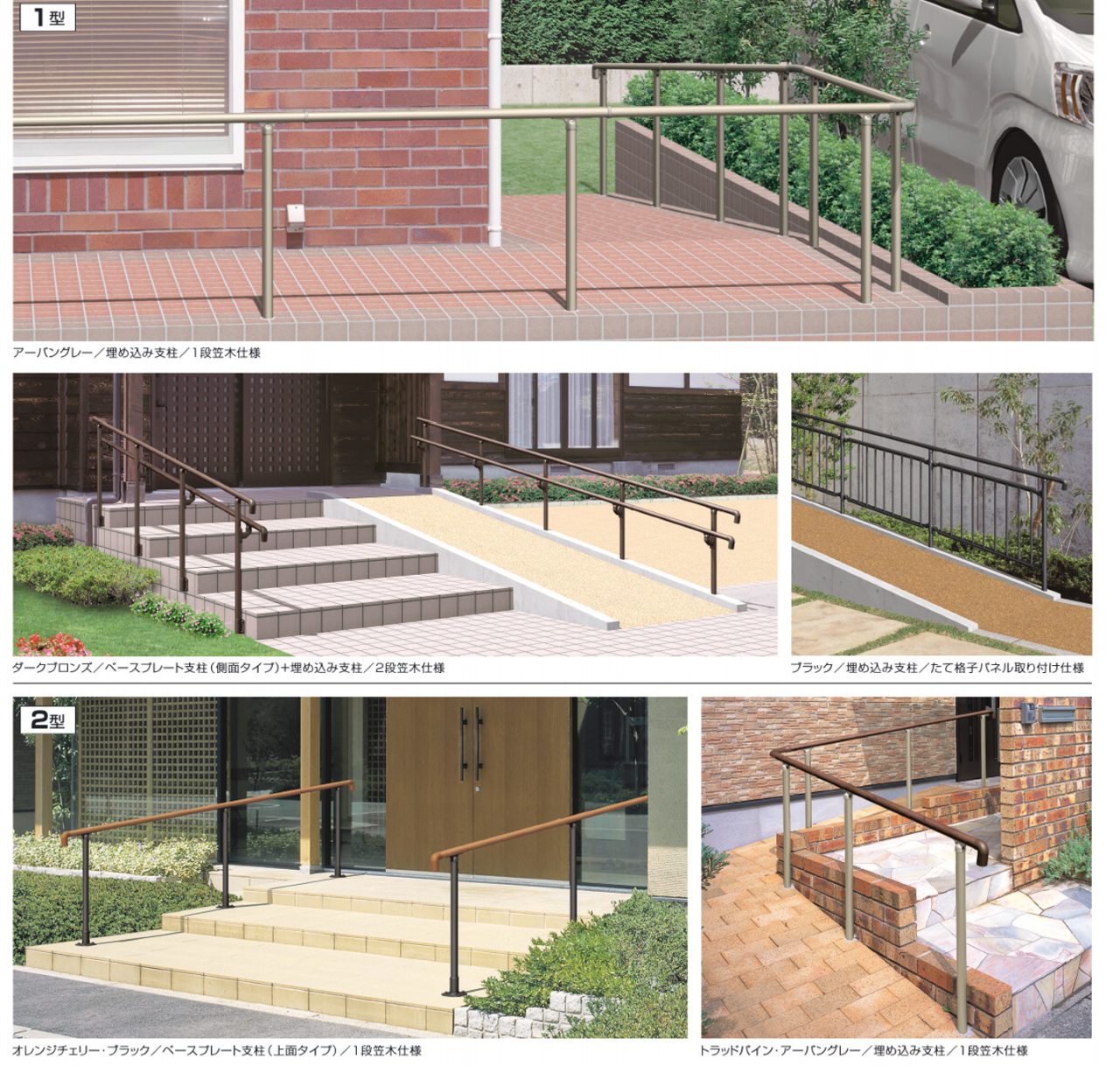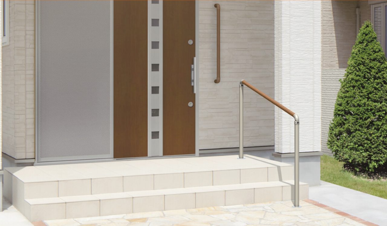 玄関アプローチの通行や動作をサポートする歩行者用補助手すりシリーズです。手の小さい方もしっかりと握り込める小さな径のエトランポSなど、幅広い住宅様式や施工条件に対応できるように納まりやカラー、オプションも充実しています。