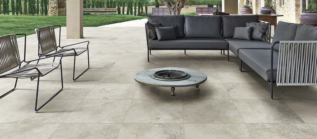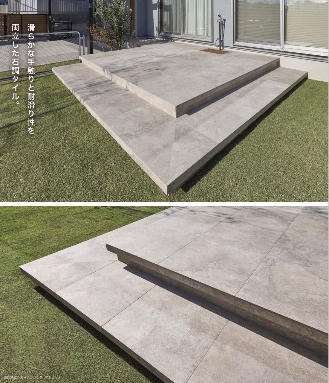 リアルな石目調の模様が高級感を演出する大判タイル。イン&アウトの床にご使用いただけるよう、滑らかさと滑りにくさを兼ね備えています。厚みも2サイズをご用意し、同じタイルでトータルコーディネートが可能です。10㎜はアプローチから壁面に、20㎜は車の乗り入れ可能ですのでカースペースにも使用できます。