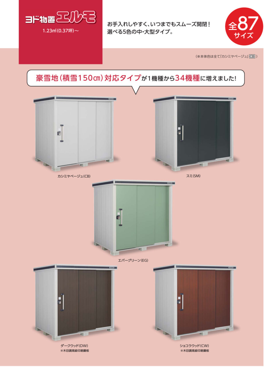 物置 ヨド物置 エルモ 間口82㎝×奥行1m52㎝×高さ220㎝ 地域限定最安値ASK 豊富なサイズバリエーションで大きいものから小物まできっちり収納。 有効室内寸法幅628㎜×高さ2030(1920)㎜×奥行1336.5㎜カラーカシミヤベージュ・スミ・エバーグリーン・ダークウッド・ショコラウッド ※サイズにより異なる オプション●別売棚●結露低減材付屋根●内アンカー