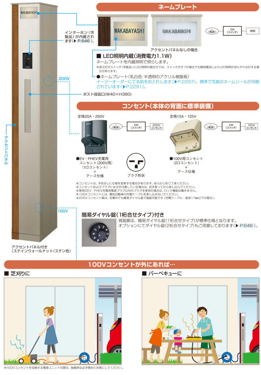 クルマは環境に負荷をかけない方向へ大きくシフトしています。その中で電気自動車はますます注目されさまざまな新型車が開発・発表されています。「エレポルト 機能門柱1型」は、そんなエコ時代の電気自動車充電に対応するべく、200V用コンセントを内蔵した機能門柱です。